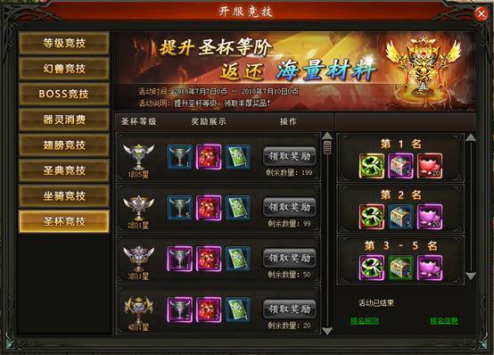 活动内容:活动期间圣杯等级达到指定等级即可领取奖励,奖励全服限量;活动开启第1天,排行前5玩家获取特殊奖励