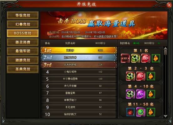 活动内容:击杀BOSS累计积分,第7天24点结算,积分排名前300的玩家可获得奖励