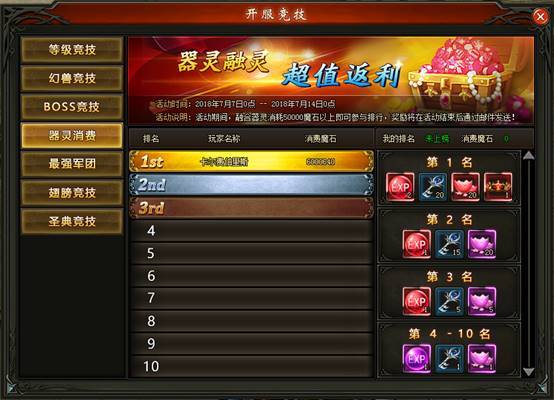 活动内容:活动期间,根据玩家融合器灵消耗的元宝进行排行,消耗50000魔石以上的玩家可上榜,排名前10的玩家可获得奖励