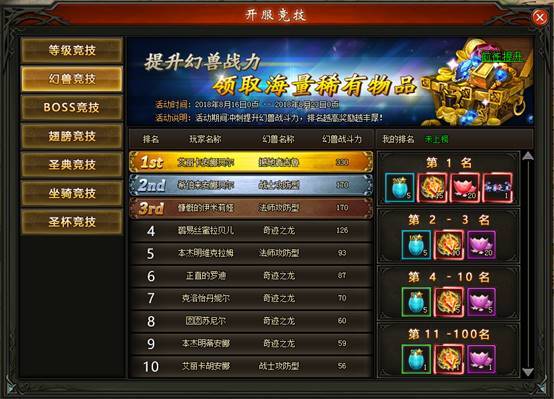 活动内容:活动期间,根据幻兽战斗力进行排名,第7天24点结算,排名前十幻兽所属玩家可获得排名奖励