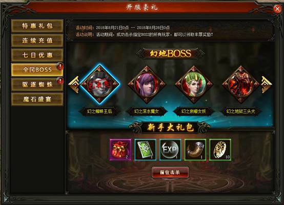 活动内容:活动期间,每在线2小时可增加1次挑战BOSS蜘蛛王后的机会,击杀后可掉落技能书残页、副幻兽、高级装备奖励。