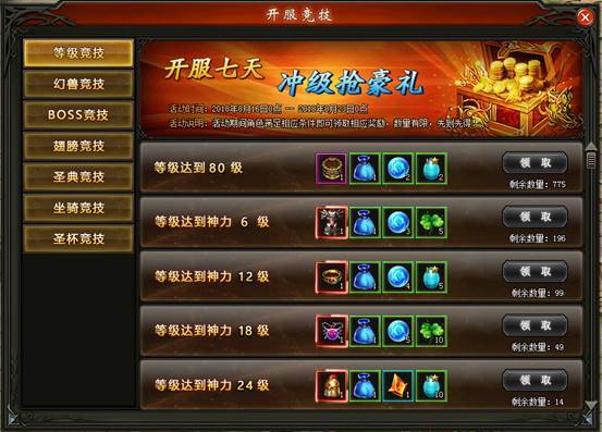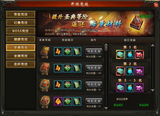 活动内容:活动期间圣典等级达到指定等级即可领取奖励,奖励全服限量;活动开启第1天,排行前5玩家获取特殊奖励