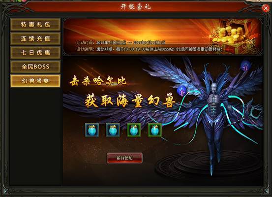 活动内容:超级BOSS觉醒之哈尔比撼世降临,击杀后可掉落海量O型幻兽,BOSS无归属,掉落可自由拾取,活动场景内不可PK。