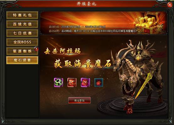 活动内容:超级BOSS觉醒之阿拉玛撼世降临,击杀后可掉落海量魔石,BOSS无归属,掉落可自由拾取,活动场景内不可PK。