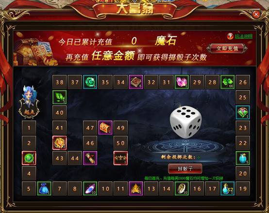 活动内容:活动期间,每累计充值2000魔石,即可获得1次投掷筛子的机会(每天首次充值任意金额即可获得1次投掷机会),可获得极品称号、时装及大量稀有材料奖励。