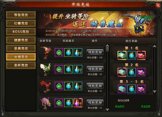 活动内容:活动期间翅膀等级达到指定等级即可领取奖励,奖励全服限量;活动开启第1天,排行前5玩家获取特殊奖励