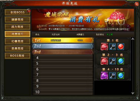 活动内容:活动期间,累计消费魔石数量达到指定数值,即可参与消费排行活动,全服排行