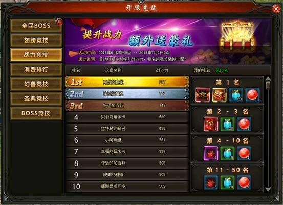 活动内容:活动期间,根据全服玩家战斗力进行排名,排名越高可获得奖励越丰厚。