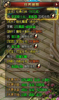 日常任务是玩家获得资源的重要途径,玩家每天可以进行魔怪大剿杀、军团任务、功勋任务和挖宝任务。