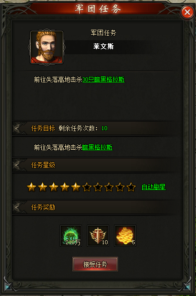 当玩家加入军团后,就可以接取军团任务了。军团任务每日可完成10次。完成军团任务可以获得军团金币和战勋值,战勋值可以用来购买军团内战勋商店的道具。