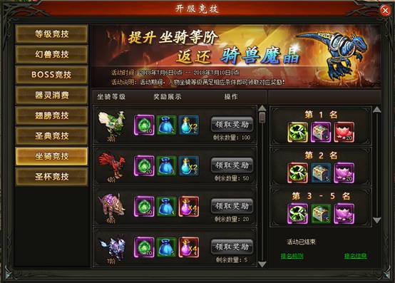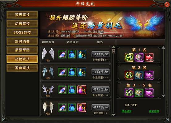 活动内容:活动期间翅膀等级达到指定等级即可领取奖励,奖励全服限量;活动开启第1天,排行前5的玩家获取特殊奖励