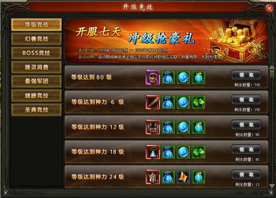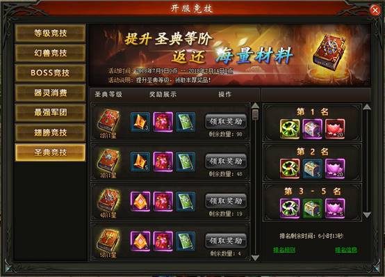 活动内容:活动期间圣典等级达到指定等级即可领取奖励,奖励全服限量;活动开启第1天,排行前5玩家获取特殊奖励