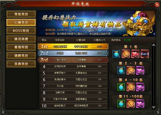 活动内容:活动期间,根据幻兽战斗力进行排名,第7天24点结算,排名前十幻兽所属玩家可获得排名奖励