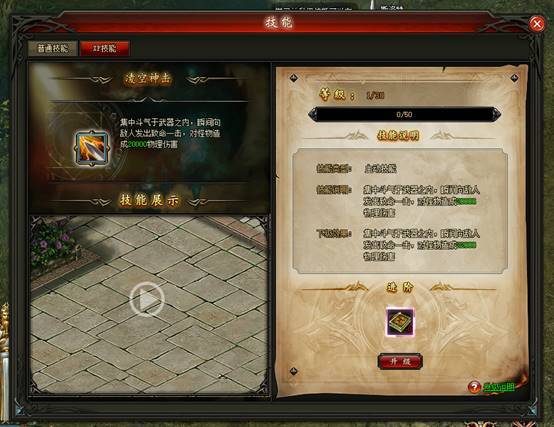 技能系统包含普通技能和XP技能。技能皆为两阶,每阶15级,进阶时需要消耗高阶技能书。