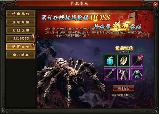 活动内容:活动期间,每在线2小时可增加1次挑战BOSS蜘蛛王后的机会,击杀后可掉落技能书残页、副幻兽、高级装备奖励。