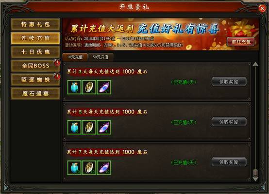 活动内容:活动期间,每天充值指定金额,连续充值天数达到2天、3天、5天、7天即可领取丰厚奖励,分为10元、50元两个档次。