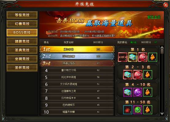 活动内容:击杀BOSS累计积分,第7天24点结算,积分排名前300的玩家可获得奖励