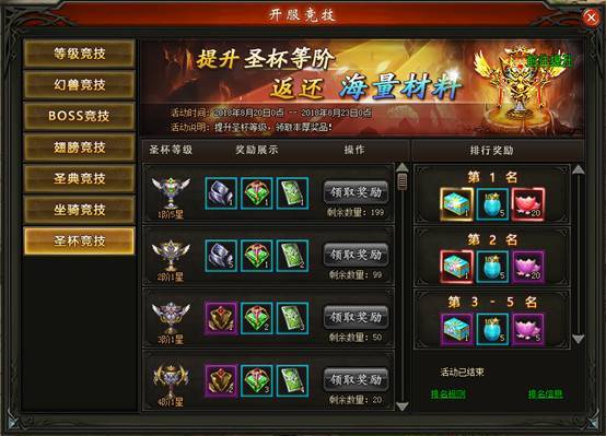 活动内容:活动期间圣杯等级达到指定等级即可领取奖励,奖励全服限量;活动开启第1天,排行前5玩家获取特殊奖励