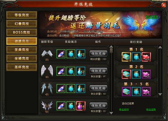 活动内容:活动期间翅膀等级达到指定等级即可领取奖励,奖励全服限量;活动开启第1天,排行前5玩家获取特殊奖励