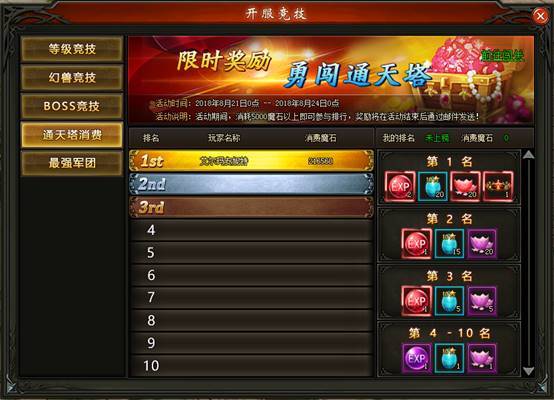 活动内容:活动期间,根据玩家参与通天塔玩法消耗的元宝进行排行,消耗50000魔石以上的玩家可上榜,排名前10的玩家可获得奖励