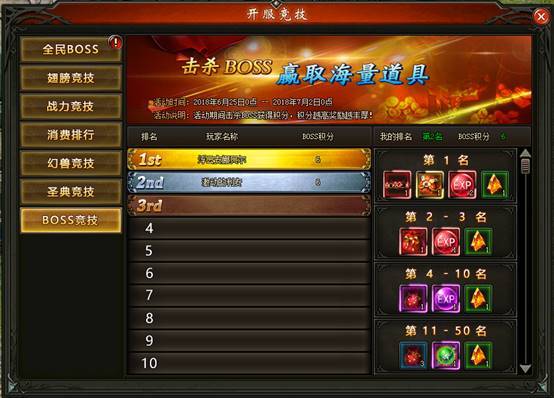 活动内容:活动期间,击杀BOSS获得积分,积分排名前300的玩家可获得排名奖励。