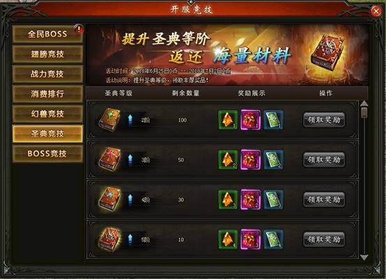 活动内容:活动期间,圣典等级达到指定等级即可获得丰厚奖励。