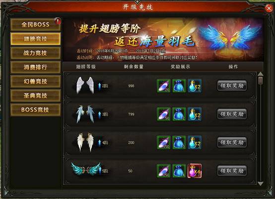 活动内容:活动期间,只要人物翅膀等级达到指定等级,即可在活动页面领取不菲的奖励。