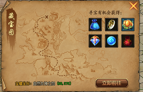 玩家通过每日活动可以获得藏宝图,玩家可以使用藏宝图来进行寻宝获得道具,每日最多可使用10次藏宝图。藏宝图分为低级、中级、高级三种,通过神灯系统可以将低级藏宝图合成高级藏宝图,越高级的藏宝图可获得的道具越稀有。