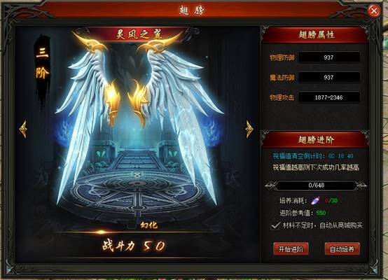 翅膀可以增加大量的人物属性。玩家可以通过消耗羽毛增加翅膀的祝福值。祝福值越高,升阶成功的概率就越大。当翅膀达到3阶以上时,祝福值就会进行每日清空。羽毛可以通过圣殿战场活动、BOSS掉落和商城购买获得。
