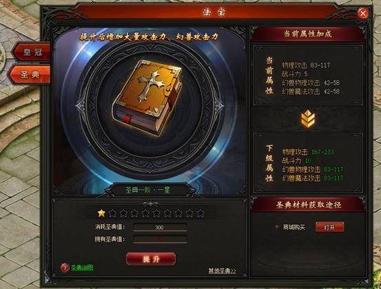 法宝分为皇冠和圣典两种,可以使用皇冠宝珠和圣典结晶增加皇冠值和圣典值。每种法宝分为七阶,每一阶有十星。当法宝升满十星后即可进行升阶。法宝材料可以通过击杀BOSS和日常副本以及商城购买获得。