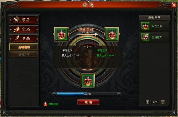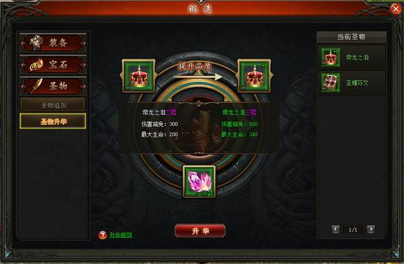 圣物分两种,帝龙之泪和圣耀符文,可在角色面板进行穿戴